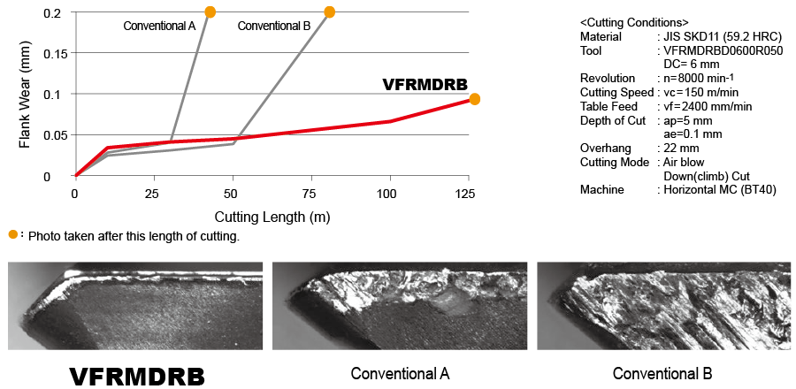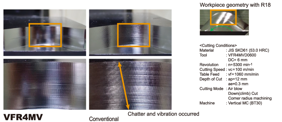Comments from Customer Evaluation· VFR4MB showed almost no wear and no change in surface roughness even though the tip was overworked on the contours of a press mould. · By making it possible to machine with a single end mill, the costs were reduced and the time problems which required a tool change every 2 hours of machining or more were resolved. In addition, the feed rate could be increased by 1.5 which shortened the machining time. |
