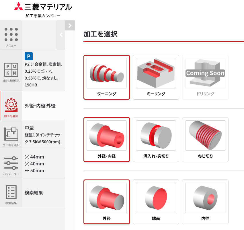加工形態に「ターニング > 外径・内径 > 外径」「ターニング > 外径・内径 > 内径」「ターニング > 外径・内径 > 端面」を新たに追加しました。 ISO旋削(外径・内径)に最適な工具を探すことができます。