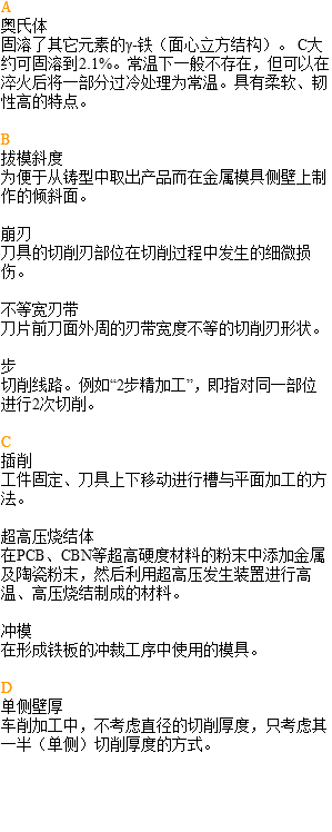 术语解释 A 奥氏体 固溶了其它元素的γ-铁(面心立方结构)。 C大约可固溶到2.1%。常温下一般不存在,但可以在淬火后将一部分过冷处理为常温。具有柔软、韧性高的特点。 B 拔模斜度 为便于从铸型中取出产品而在金属模具侧壁上制作的倾斜面。 崩刃 刀具的切削刃部位在切削过程中发生的细微损伤。 不等宽刃带 刀片前刀面外周的刃带宽度不等的切削刃形状。 步 切削线路。例如“2步精加工”,即指对同一部位进行2次切削。 C 插削 工件固定、刀具上下移动进行槽与平面加工的方法。 超高压烧结体 在PCB、CBN等超高硬度材料的粉末中添加金属及陶瓷粉末,然后利用超高压发生装置进行高温、高压烧结制成的材料。 冲模 在形成铁板的冲裁工序中使用的模具。 D 单侧壁厚 车削加工中,不考虑直径的切削厚度,只考虑其一半(单侧)切削厚度的方式。