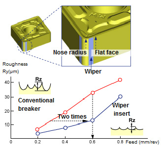 Improvement in surface finish is not only due to the advantage of using wiper inserts. The feed can be increased while maintaining surface roughness and this leads to a dramatic improvement in machining efficiency and a reduction in machining costs. Moreover, increased feed improves chip control and reduces the number of inserts required per production batch making wiper inserts ideal for high efficiency machining.